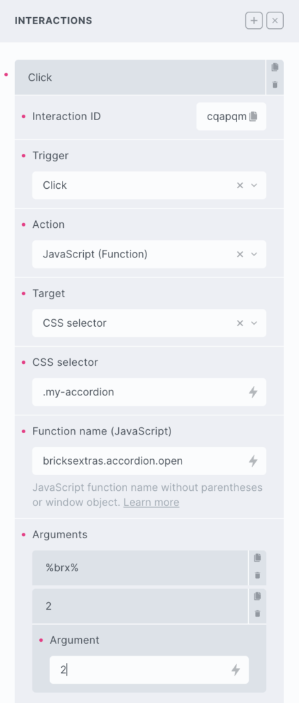 From v1.4.1, many BricksExtras elements can be controlled through the interactions panel. Sometimes you may need something to happen based on an action, something not available from the settings. See the individual element docs for more details, under the ‘interactions’ tab and scroll to ‘Actions’ to find any actions available.