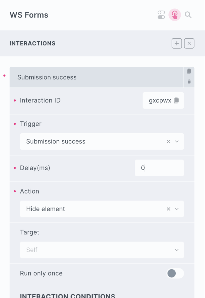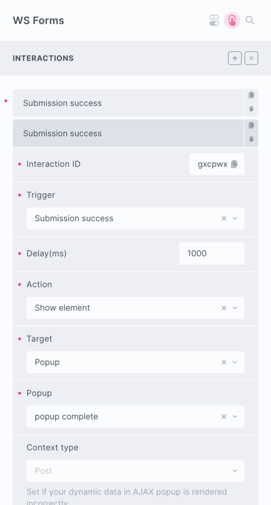 As it’s the WSForms element that we’re listening to (we’re waiting for the user to submit a form before doing anything), this is the element we want to add the interactions to.