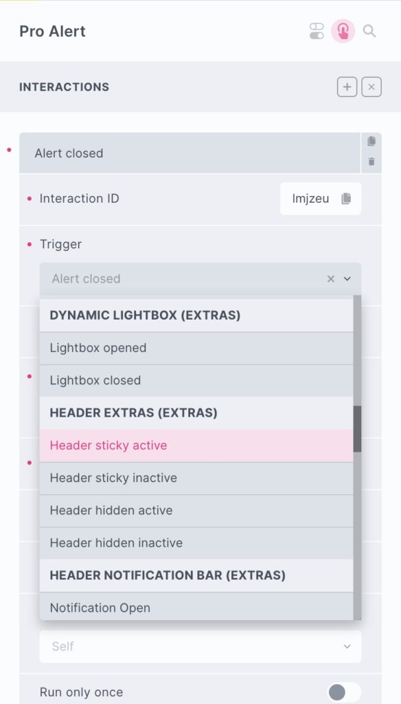 For the most common functionality in the element, generally, we’ll add it in as an option for simplicity. For example, moving the user focus when an OffCanvas opens, or syncing burger triggers, are commonly needed features that should be built-in. But for the edge cases, maybe you want to toggle the background color of your header only when slide menu opens – it’s not something we’re likely to add a specific setting for, it’s too unique (and adding everything in as a new options is only going to bloat a plugin), and so this opens up more possibilities of being able to create your own types of “when X happens, do Y” direct in the UI.