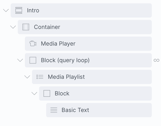 You can use a query loop to build an entire playlist based on dynamic data by looping the items, and then customise the layout freely (no different to building a list of posts). As the user browses the playlist & clicks the items, it will load the media into the player to match the currently selected item.
