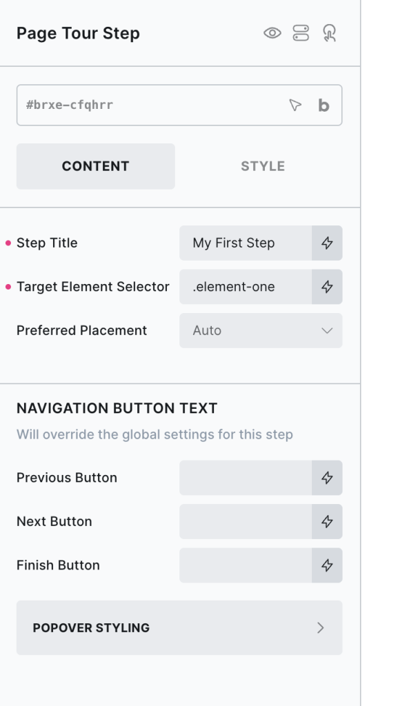 Styling Step Popovers – The steps within a tour can all be styled from the parent page tour element, but also can be styled at an individual level in the page tour steps element settings.