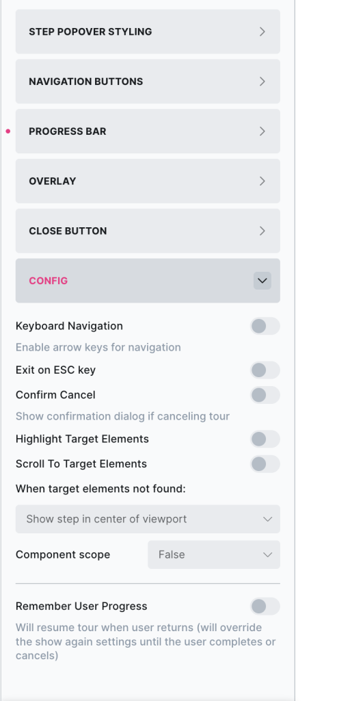 Here you’ll find the configuration options. How to trigger the tour to start, when to show the same user the tour (similar to the modal/notification element functionality), change all the navigaton buttons and styling for all the steps.
