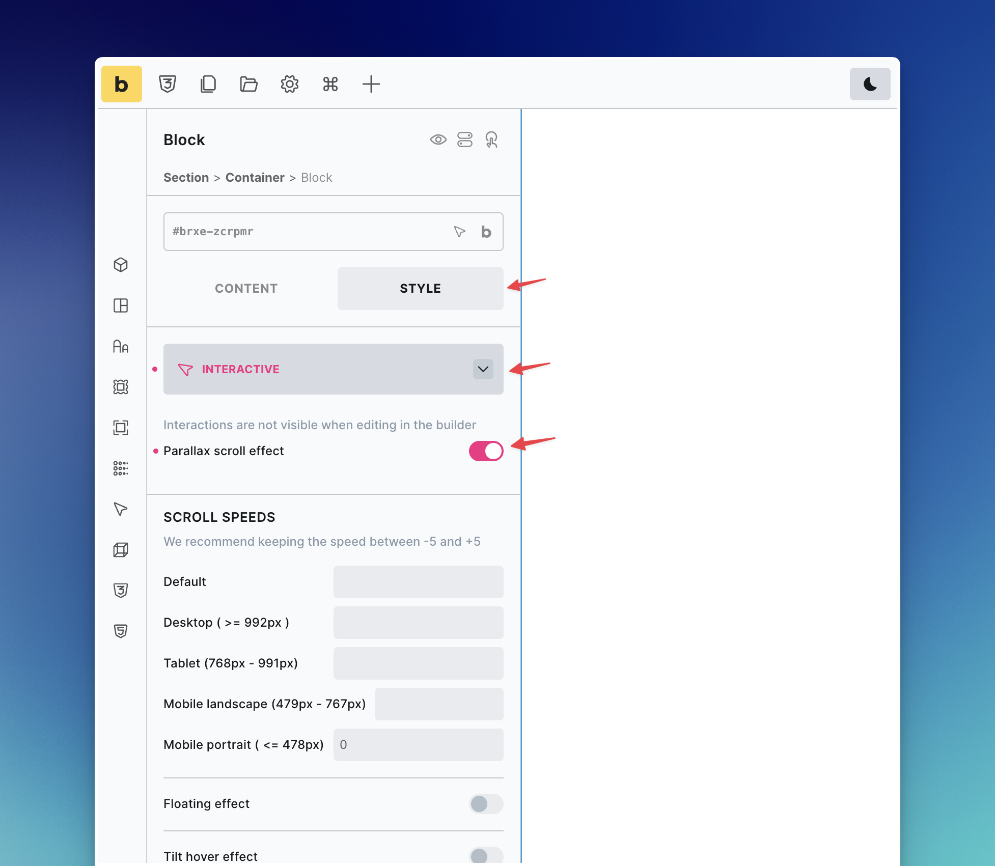 This feature can be activated from the ‘interactive’ tab inside any native element. If adding to an image, it’s recommended to wrap in a div or block and instead add the functionality there (or add a overlay to create a wrapper for the parallax).