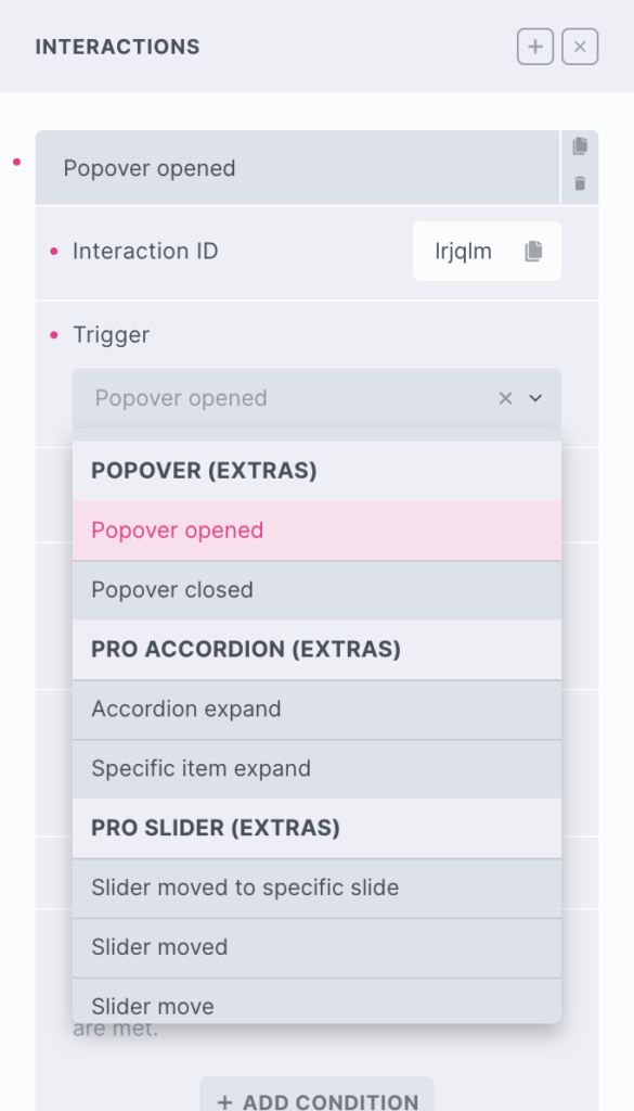 This element has it’s own interaction settings. Refer the interactions tab below for the list of element-specific triggers and/or actions.