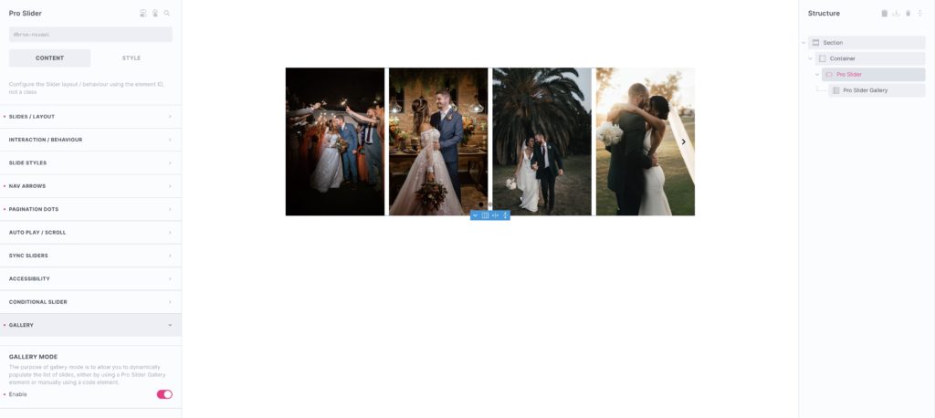 - Replace any slides or inner content of the Pro Slider with the dedicated Pro Slider Gallery element. (This will populate with slides containing the gallery)