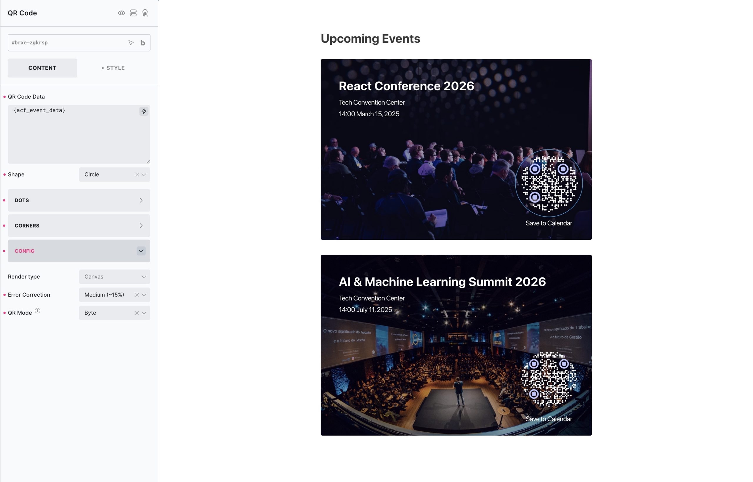 The QR Code element generates customizable QR codes, ideal for contact pages, event tickets, product information, or anywhere you need to share scannable data.