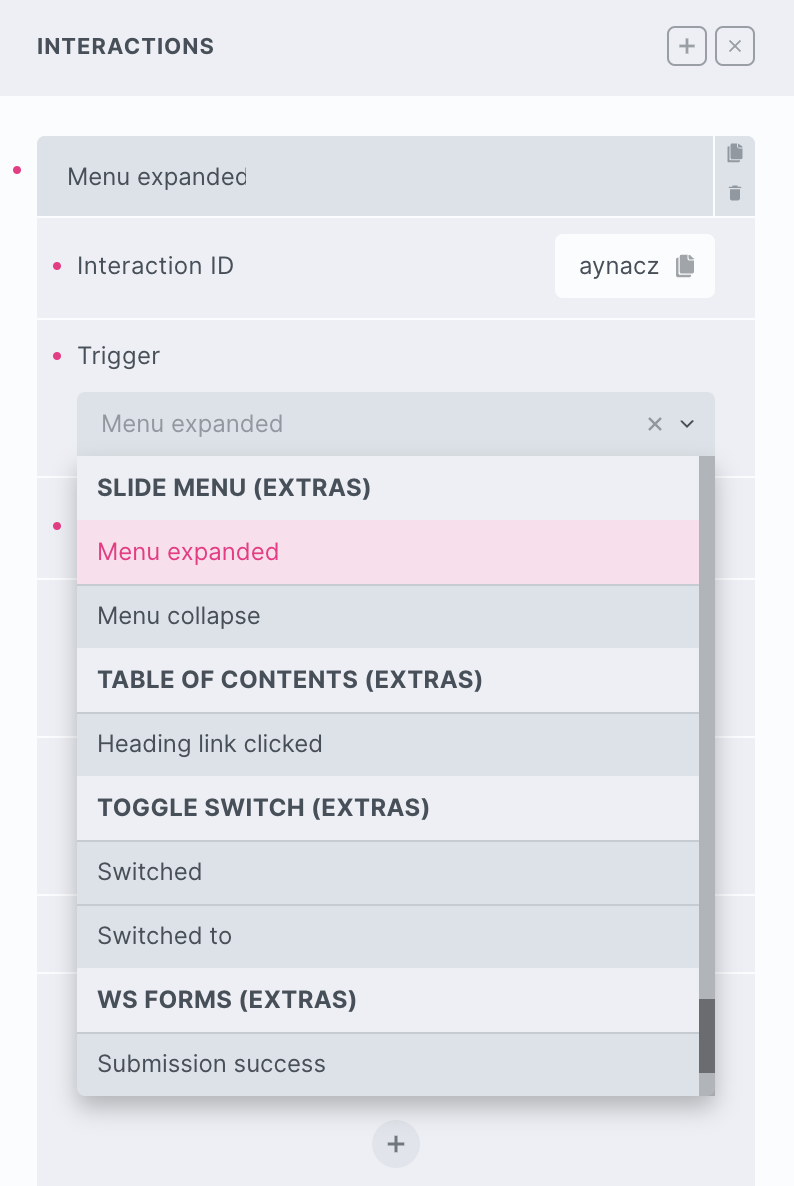 This element has it’s own interaction settings. Refer the interactions tab below for the list of element-specific triggers and/or actions.
