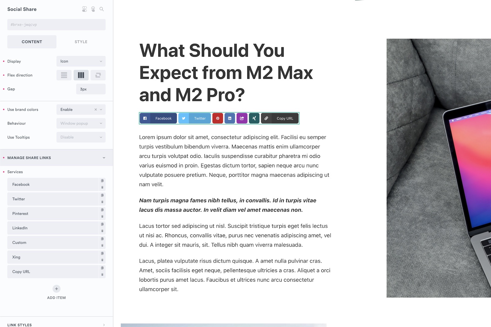Add share links for social networks. Comes with support for adding any number of custom dynamic links, mix & match between styles of the links, includes 10 popular social networks out of the box and window popup option for quicker sharing without the user needing to open a new tab.