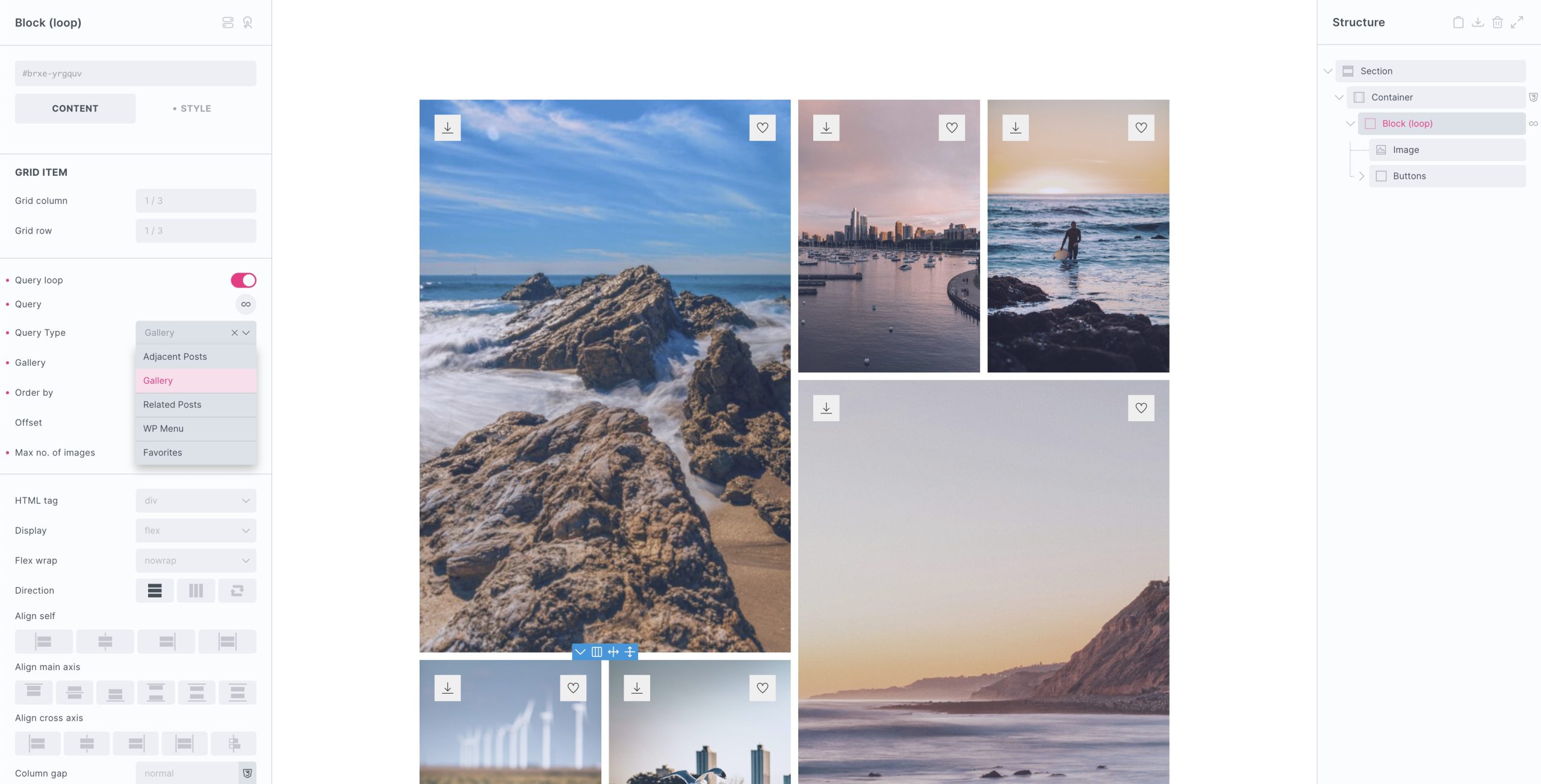Galleries from custom fields (ACF Gallery, Metabox Advanced Image) can now be looped through with the Gallery Query Loop. This allows much more layout options than the native gallery element (grid/flex/sliders).